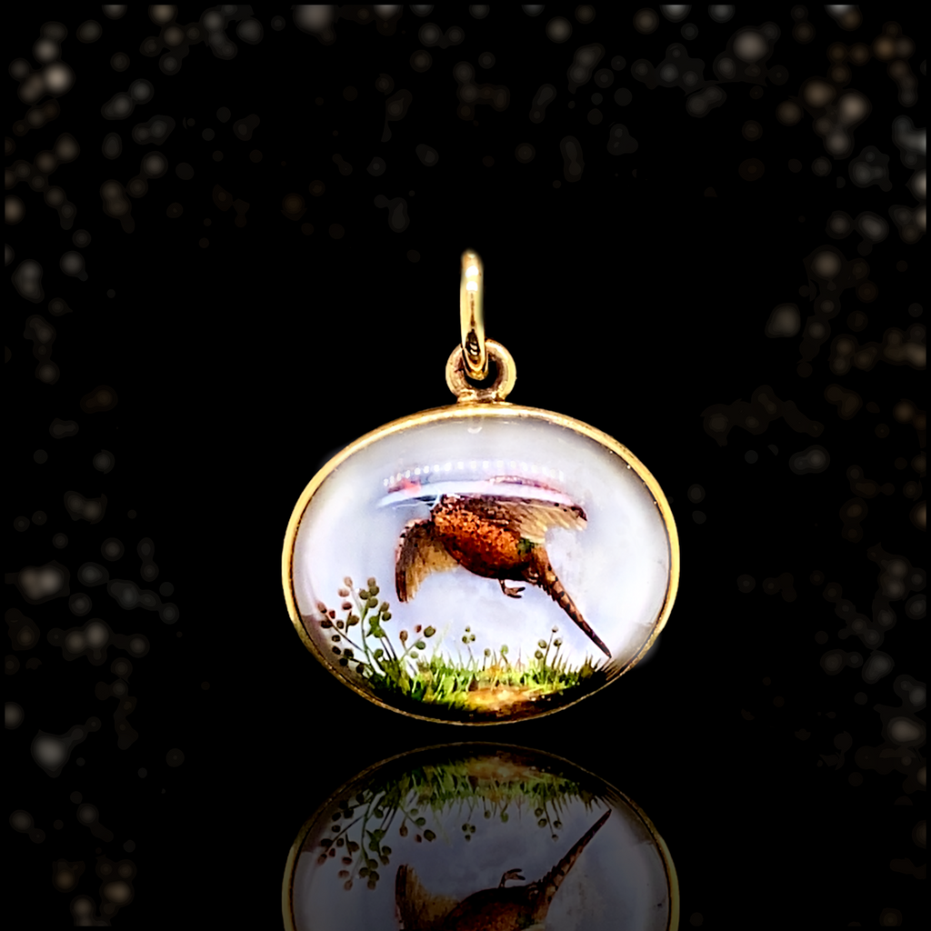 An exceptional Victorian c.1890–1900 Essex crystal pendant, featuring a Ring-Necked Pheasant (Phasianus colchicus) reverse carved beneath rock crystal, painted and backed with mother of pearl, modelled in 18k gold and hallmarked.