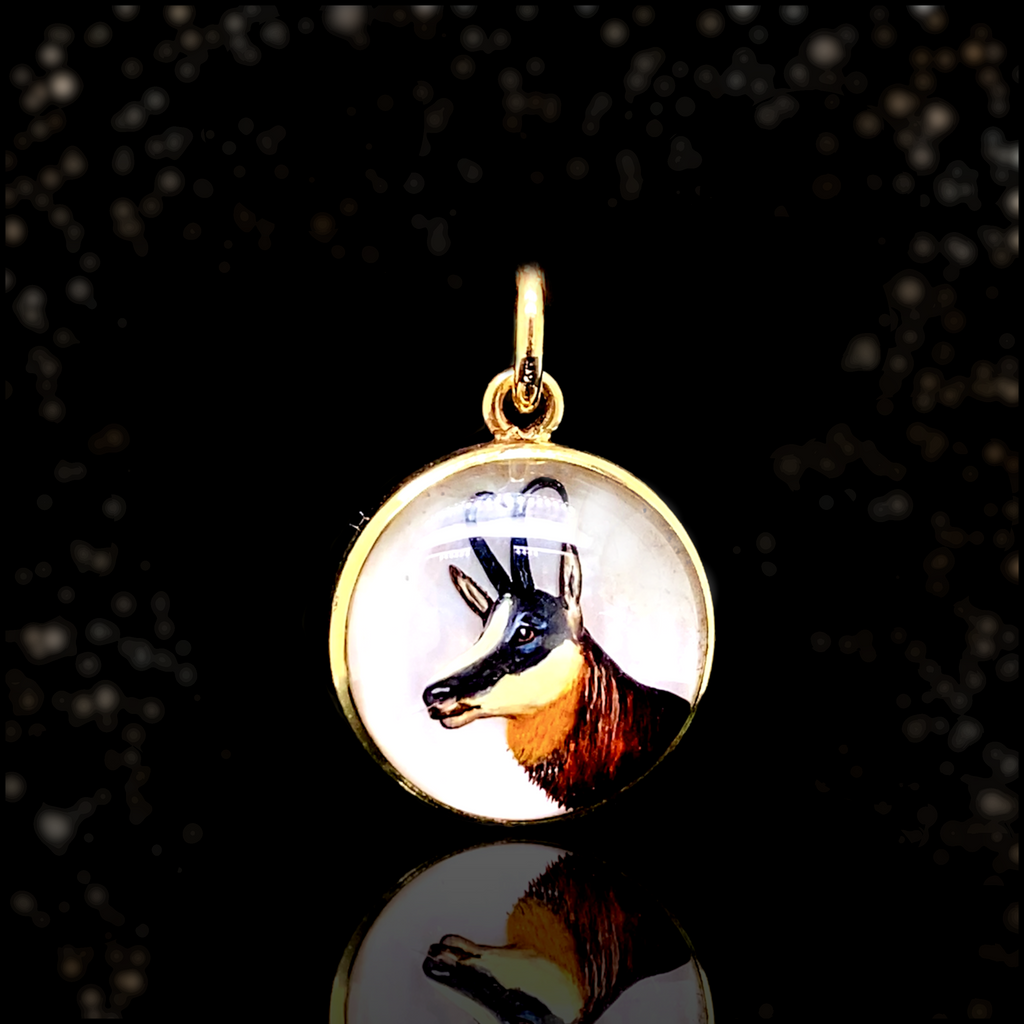 An exceptional Victorian c.1890–1900 Essex crystal pendant, featuring a Moose (Alces alces) reverse carved beneath rock crystal, painted and backed with mother of pearl, and modelled in 14k gold.