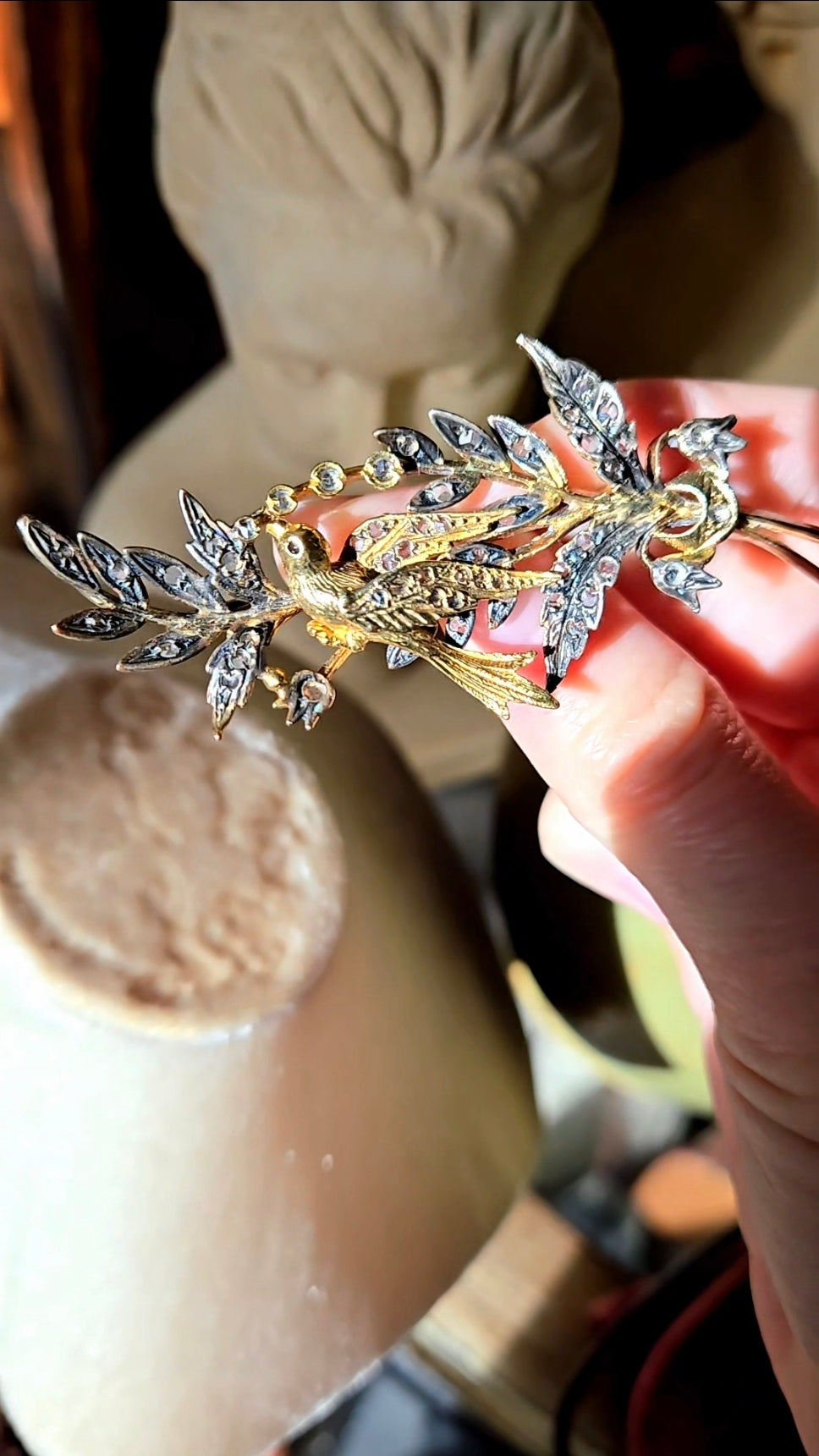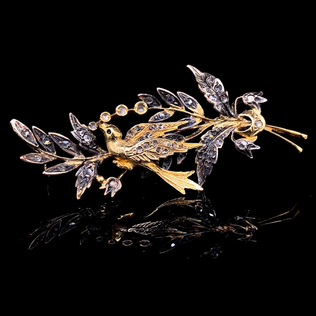 A beautiful German Victorian c.1880-1890 white sapphire bird floral spray bouquet brooch modelled in 18k gold wash topped silver, hallmarked.